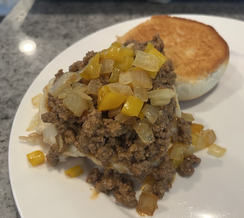 - Optional: We sauteed additional chopped onions and yellow peppers to put on top of the sloppy joe. Yum!