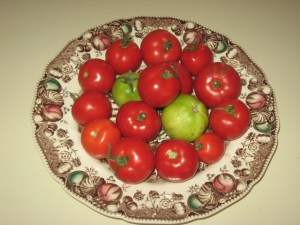 Every year I plant a vegetable garden with several varieties of tomatoes, onions, peppers, eggplant, green beans, zucchini, yellow squash, cilantro, basil, rosemary and thyme. 2011 was not my best year in the garden. Tomatoes were late to set but were coming on strong just in time for the first frost. I picked all of the green tomatoes and brought them in the house to ripen. Today is the day that this last memory of summer will create a wonderful fresh tomato salsa to share with neighbors and family this weekend.