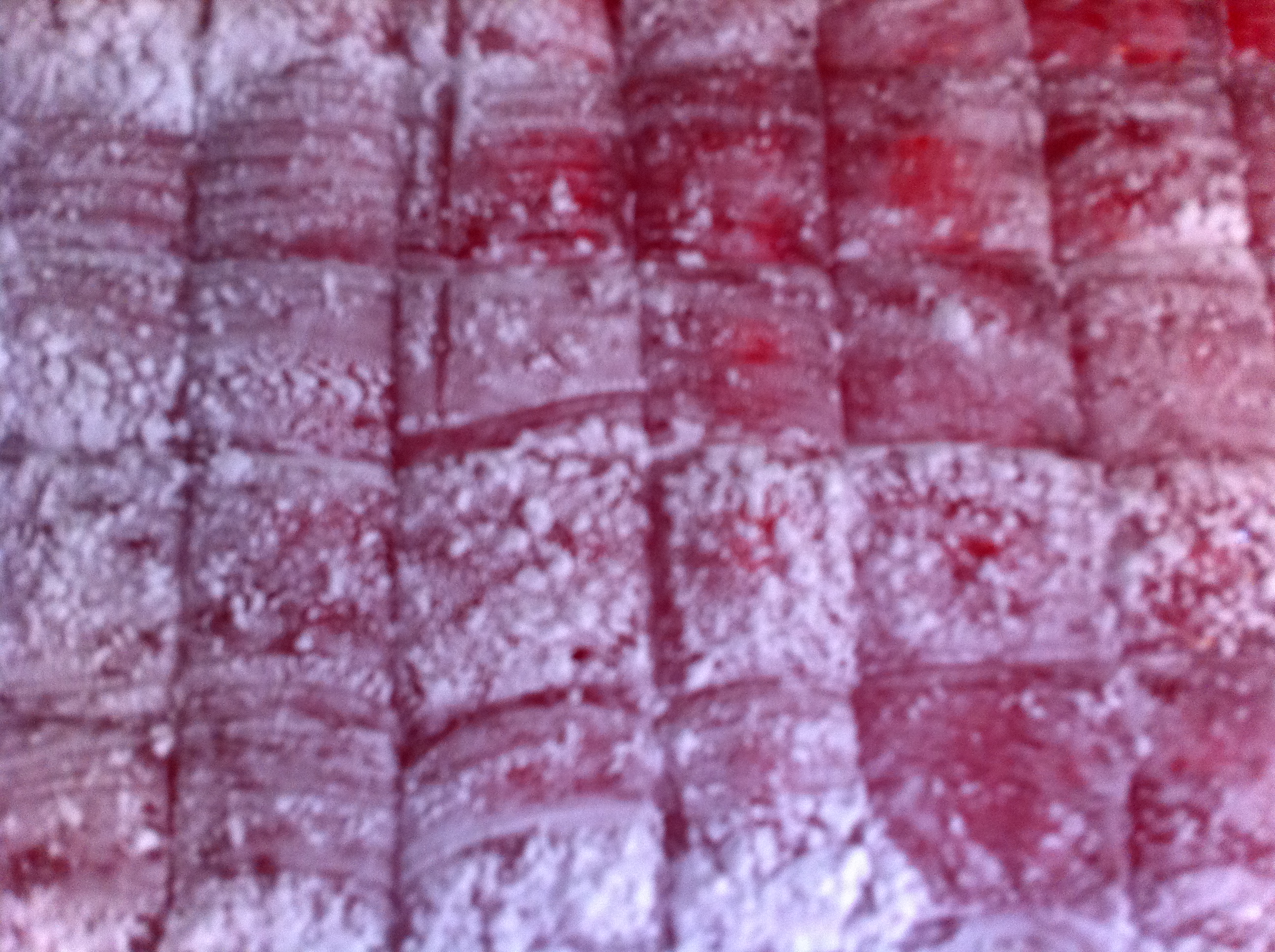 - Pour into a metal pan that has been lined with about 1/4 to 1/3″ powdered sugar.