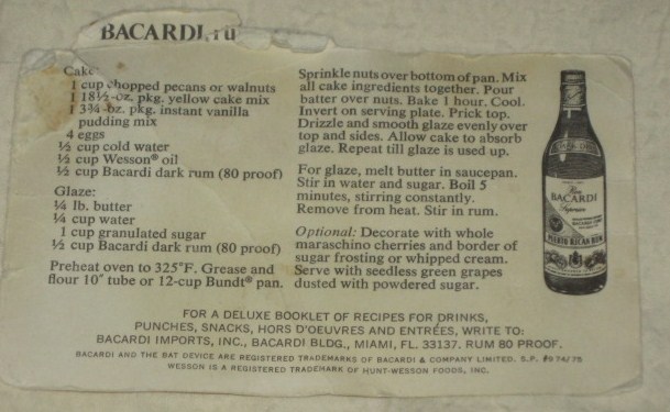 Original Bacardi Rum Cake Recipe December 23, 2011 cathysmaha Share this: Click to print (Opens in new window) Print Tweet Click to email a link to a friend (Opens in new window) Email Share on TumblrLike Loading... Share this: Click to print (Opens in new window) Print Tweet Click to email a link to a friend (Opens in new window) Email Share on TumblrLike Loading...