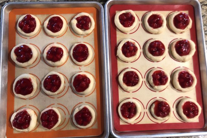 My all-time favorite Kolache is cherry. This season I was fortunate to buy a large container of fresh frozen tart cherries that I’ve been saving for Kolache filling this Christmas. Other years, I have used canned cherry pie filling. I have made Kolaches from old-fashioned sweet dough recipes but a new favorite is the sweet dough recipe for the bread machine. In a pinch, I have used frozen bread dough, even though not sweet, is very good.