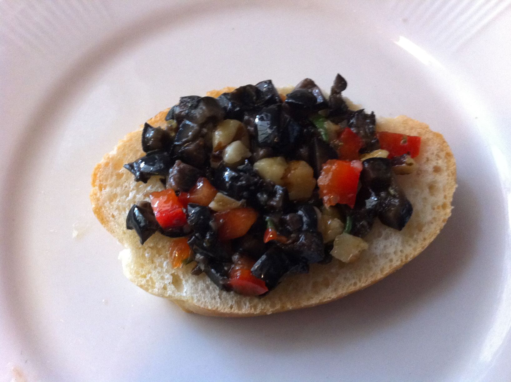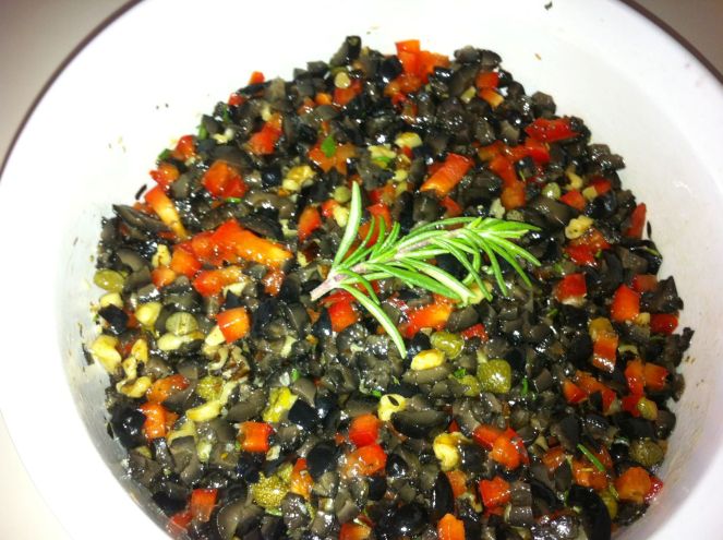 Finely chopped the black olives, walnuts and red peppers. Add olive oil, capers, rosemary, Italian seasoning, and minced garlic; stir together.