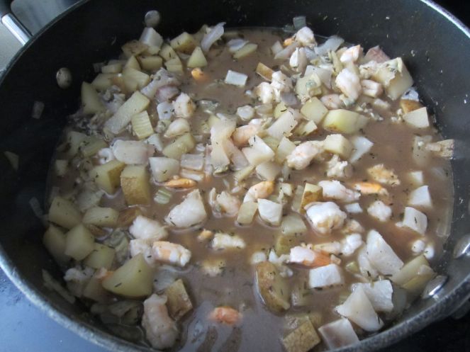- Add clams with juice, fish and shrimp. Cook over med heat about 10 min