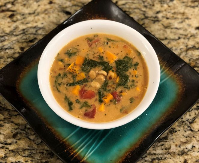 SPICY PEANUT SOUP WITH SWEET POTATO & KALE
