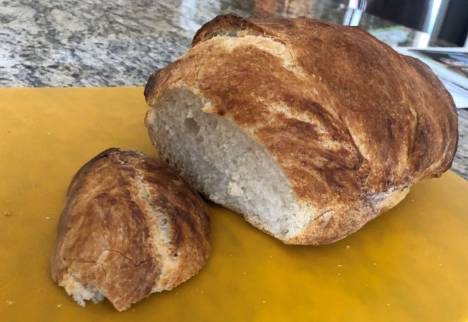 - Finish the bread: Bake for 30 minutes with the lid on, after which remove the lid and bake for another 15 to 20 minutes until golden brown. Remove the bread from the pot, it should fall out easily. Let cool completely before slicing into it and serving.