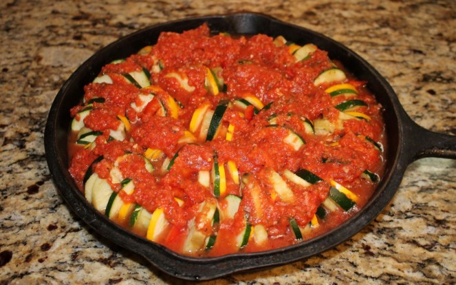 - Layer the sliced vegetables vertically around the skillet, packing them as tight as you can. (We find that it is easier to layer the zucchini, squash, and eggplant in the skillet and then go back in and tuck the red peppers within the layers after the other vegetables have been filled in.)