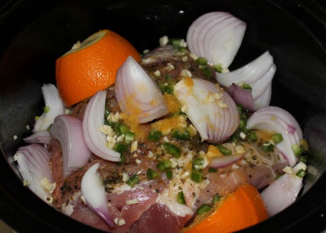 • Place the pork in a slow cooker and top with the onion, garlic, and jalapeno.