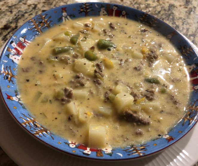 I modified the recipe a bit and added green beans so there was something green in the soup.  After eating it, I decided I will add broccoli next time for a Cheeseburger Broccoli Soup, combining another favorite.