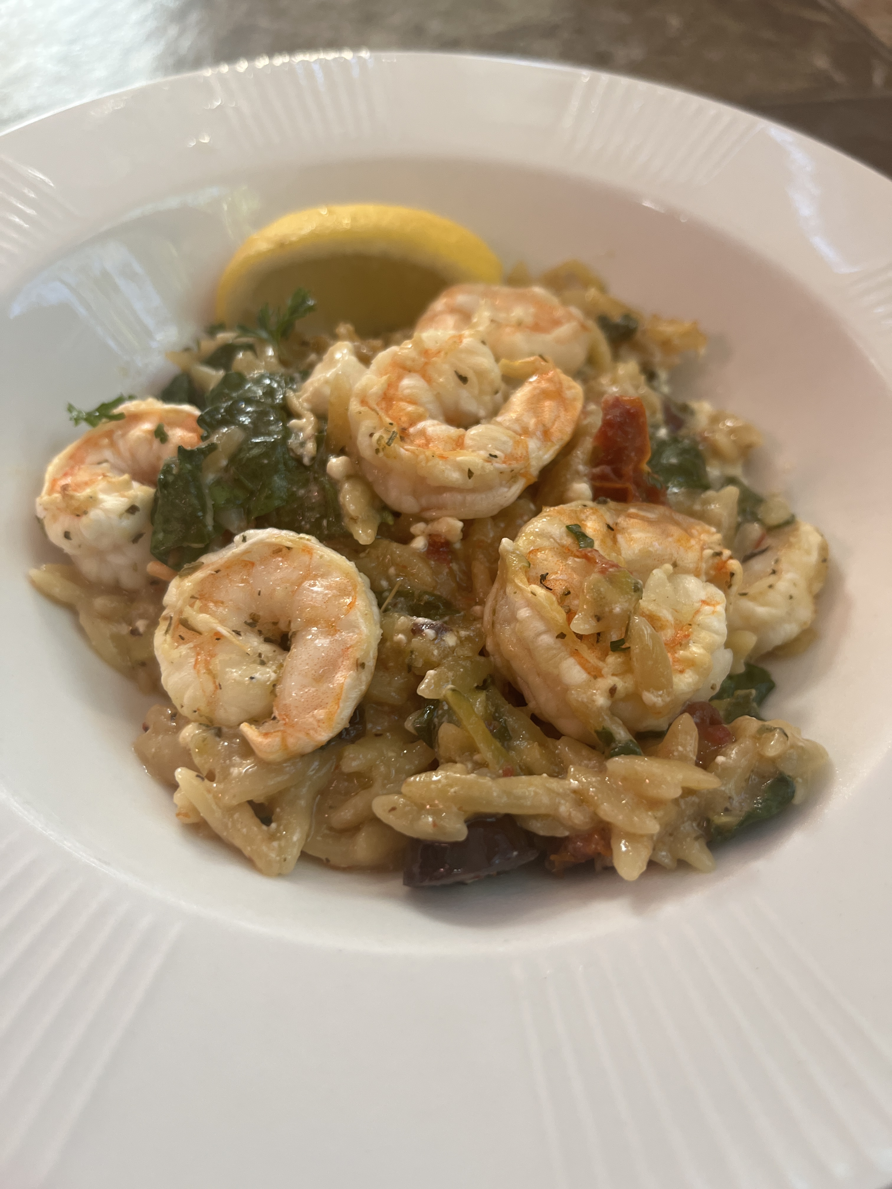 - In a 9×13 inch baking pan, add in the olive oil, orzo, zucchini, sun dried tomatoes, olives, garlic, broth, Italian herb blend, onion powder, salt, pepper and mix together until combined. Next, cover with parchment paper and aluminum foil and bake for 20 minutes. Then, take it out of the oven, uncover, add in the spinach and feta and mix until incorporated. Top with the shrimp and pop back in the oven for 8-10 minutes uncovered. Stir it all together and serve with fresh lemon juice and basil or parsley.