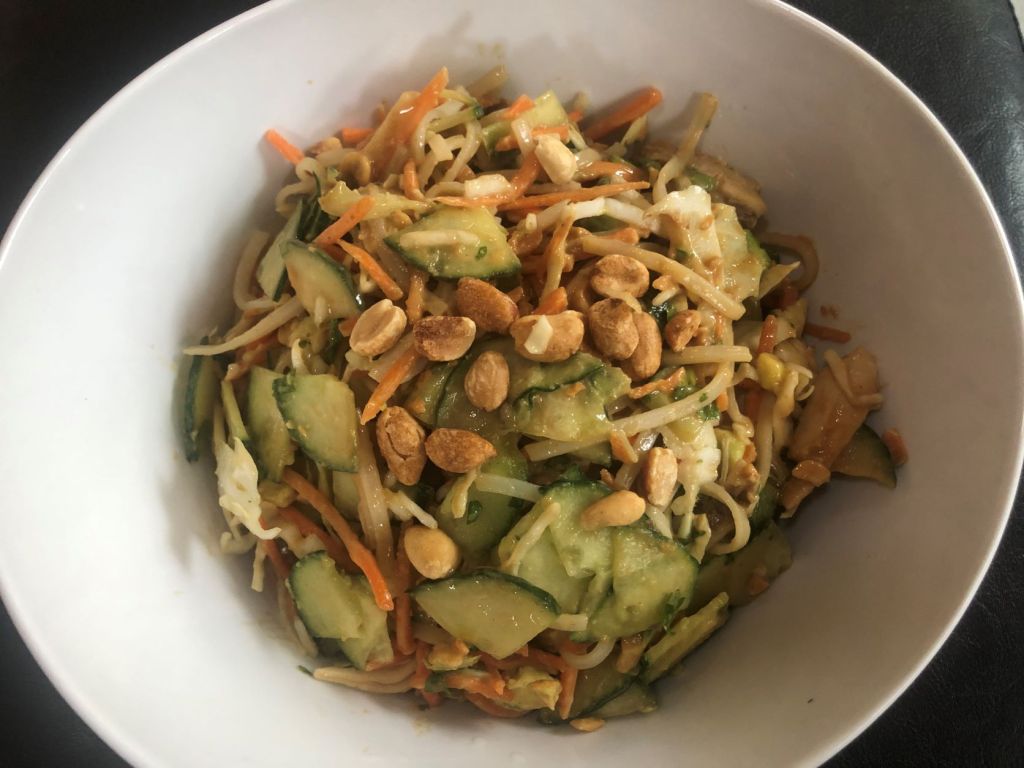 Boil noodles according to package directions, then add to the pan with the veggies; mix together, then turn off the heat and mix in the cabbage, cucumber, scallions, peanuts and sauce.