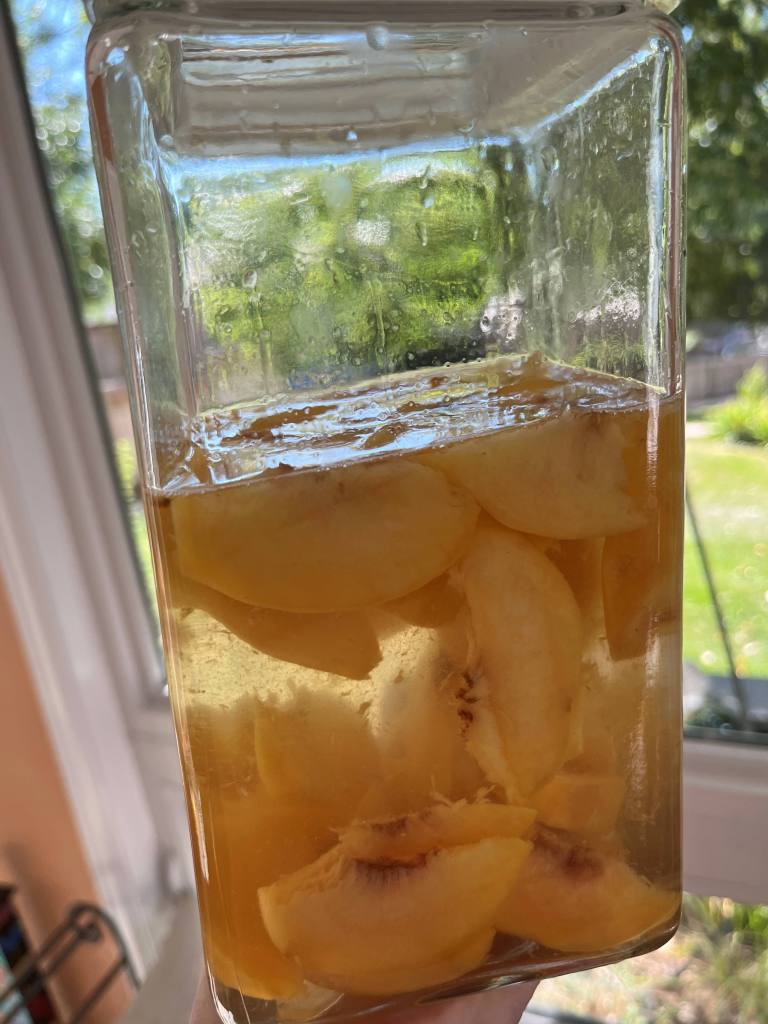 - In a large glass jar, combine the chopped peaches with the vodka. Make sure the fruit is fully submerged in the liquid.