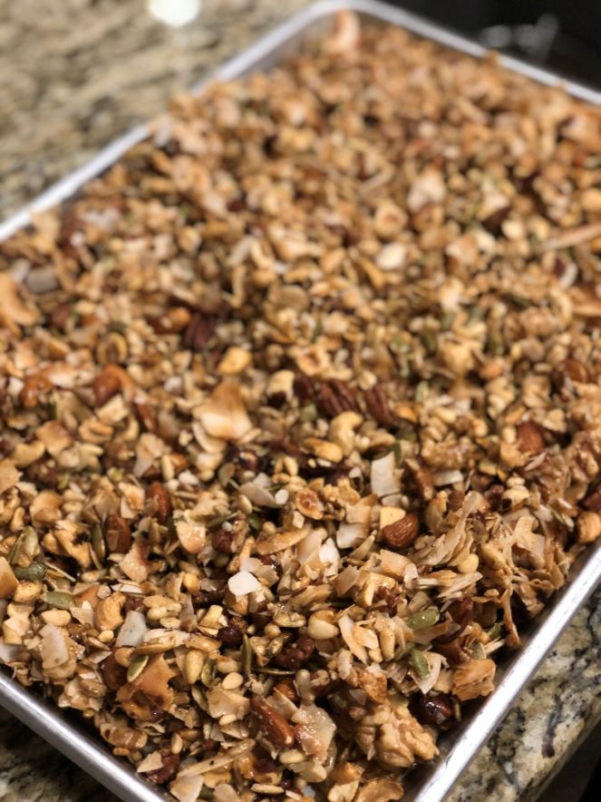 My dear friends, Mr. & Mrs. Santa, often visit me for summer holiday to escape the North Pole cold. During one visit they brought Santa’s delicious Nutola to have for breakfast. Wow! It was almost as magical as the reindeer on Christmas Eve. It’s wonderful with yogurt or as a snack. I made a batch and froze much of the batch to enjoy later.