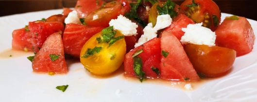 I served this in July with tomatoes and watermelon in season. It is a refreshing salad especially during the hot days of summer. The salad was served with the feta on the side since some of our members are Vegan.  Easy peasy and satisfies all.  What a wonderful fusion of great flavors.  It’s now one of my favorite summer treats.