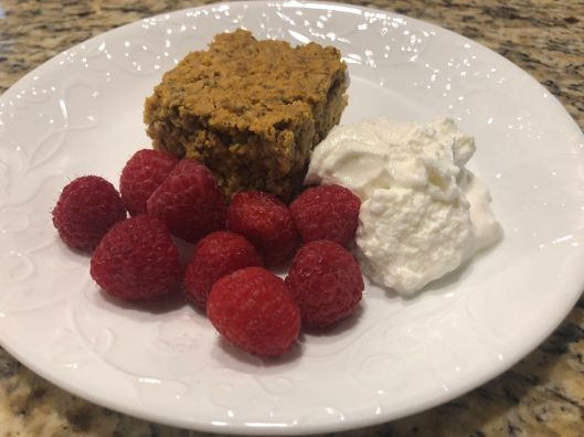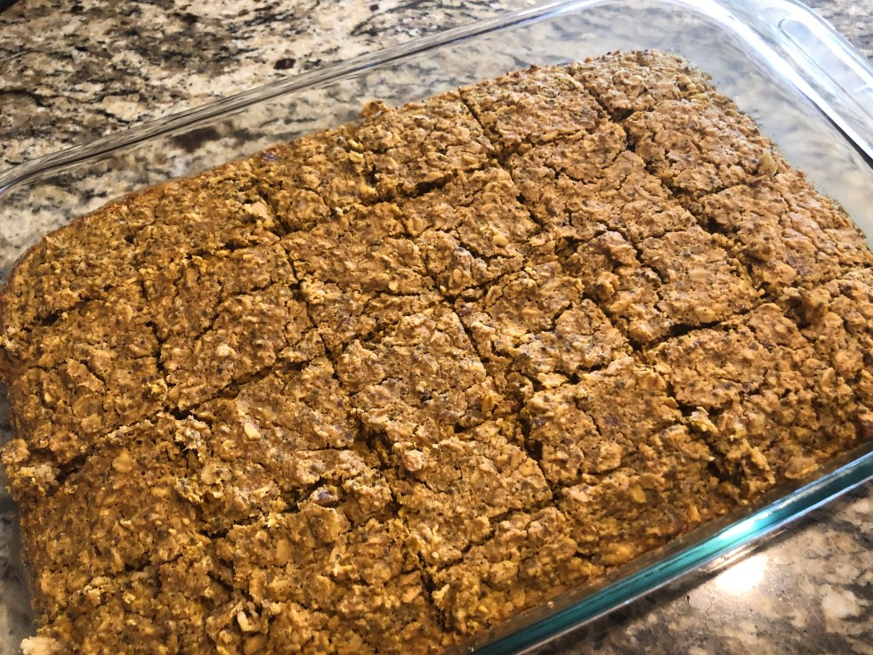 4. Bake for 35-40 minutes or until the edges are golden brown and the center has set.  Cool before slicing into bars and store in the refrigerator.  Alternatively, you can individually wrap the bars in Saran Wrap and freeze.