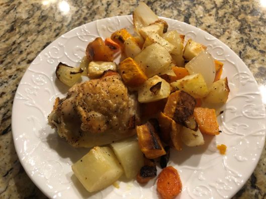 I’ve listened to the podcast ‘The Lazy Genius’ for a while and especially enjoyed the episode talking about her recipe ‘Change Your Life Chicken’.  It sounded so easy and I love roasted vegetables.  Never in my life have I set my oven for 500 degrees F, but I was up for the experiment.  I chopped carrots, sweet potatoes, potatoes and onions.