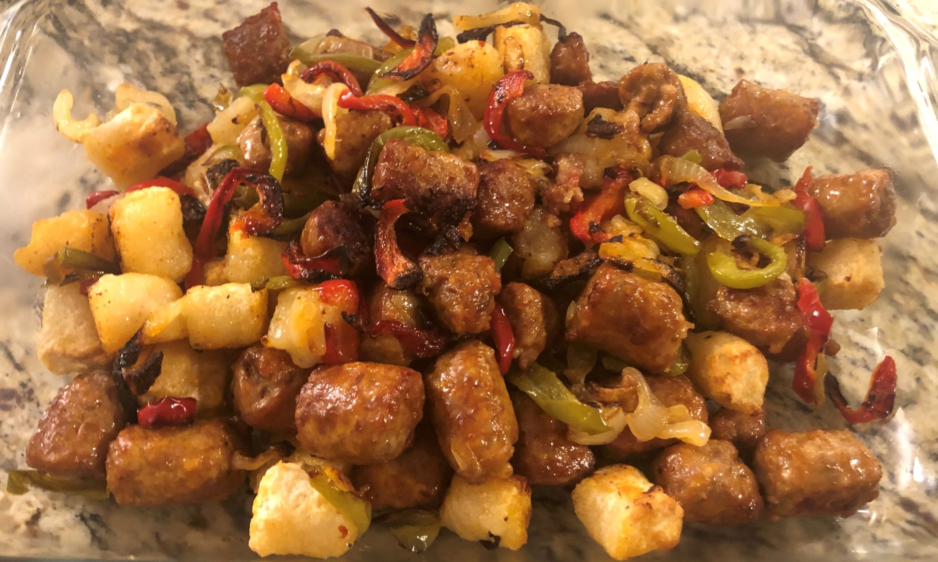 - Place the sausage, peppers and onions mixture into a medium size bowl. Mix in the breadcrumbs, shredded cheese, parmesan cheese and egg and set the mixture aside.
