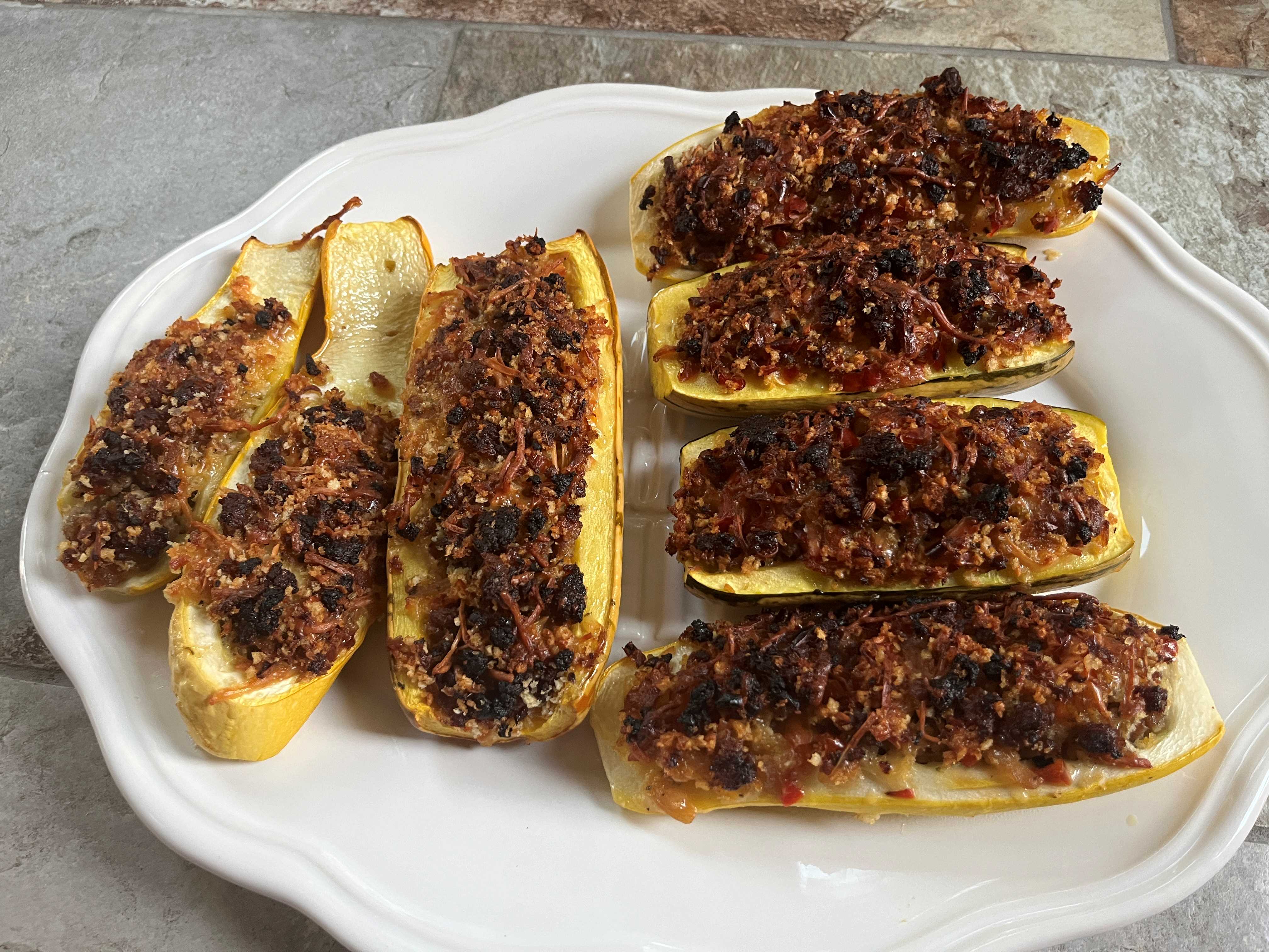 Last year I had many yellow squash in my garden. While I like roasting vegetables or making lemon yellow squash bread, I needed a new recipe. This recipe is so delicious! I doubled the recipe and the leftovers were just as good as when it was first served. The photo makes it look like I burned the squash, but I did not and it was perfect. You can bake for a lesser time as well. I also experimented with delicata squash and found the rind was too tough. You could easily substitute zucchini for the yellow squash.