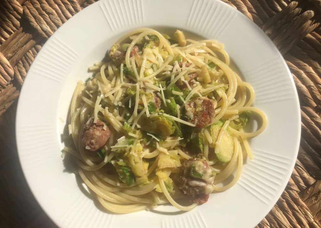 - Using tongs, transfer spaghetti from pot to skillet then add parmesan cheese and cooked sausage. Add a generous drizzle of extra virgin olive oil and enough pasta cooking water to help the parmesan cheese melt and evenly coat the pasta. Taste then season with salt and lots of freshly cracked black pepper, and then serve.