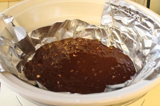- Pour the batter into the slow cooker, set at a low temperature and cook for 3 hours.