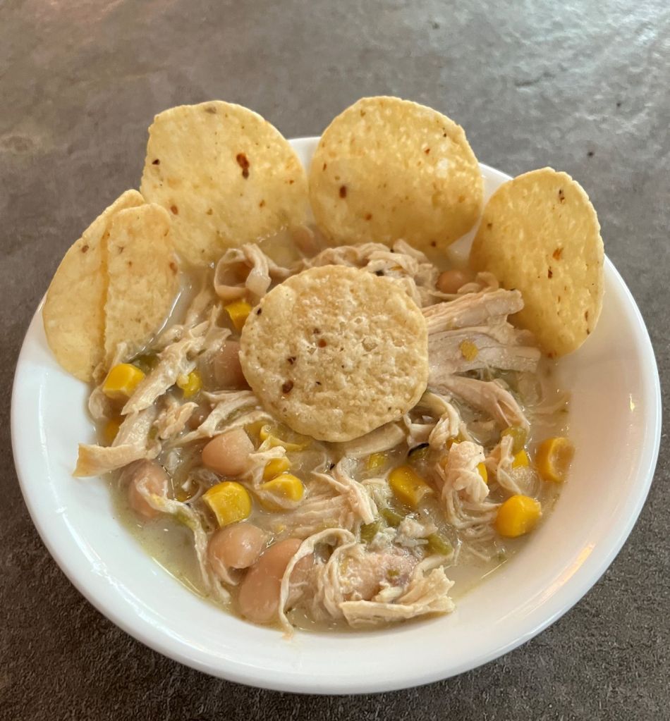 White Chicken Chili is a stick to your ribs, flavorful soup for cold weather. The original recipe does not have corn and thickens the chili with flour and milk. I chose to add cream cheese, inspired by other recipes. I serve with cilantro, cheese and chips but add whatever inspires you.
