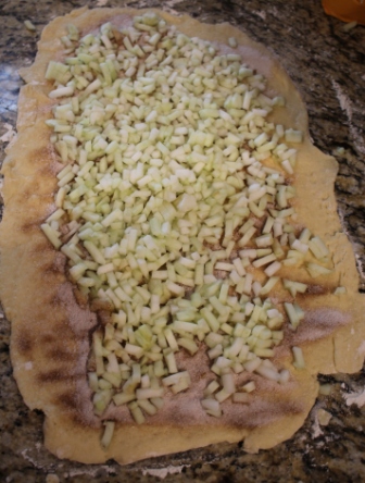 • Sprinkle sugar and cinnamon over rolled out dough. Add chopped apple.
