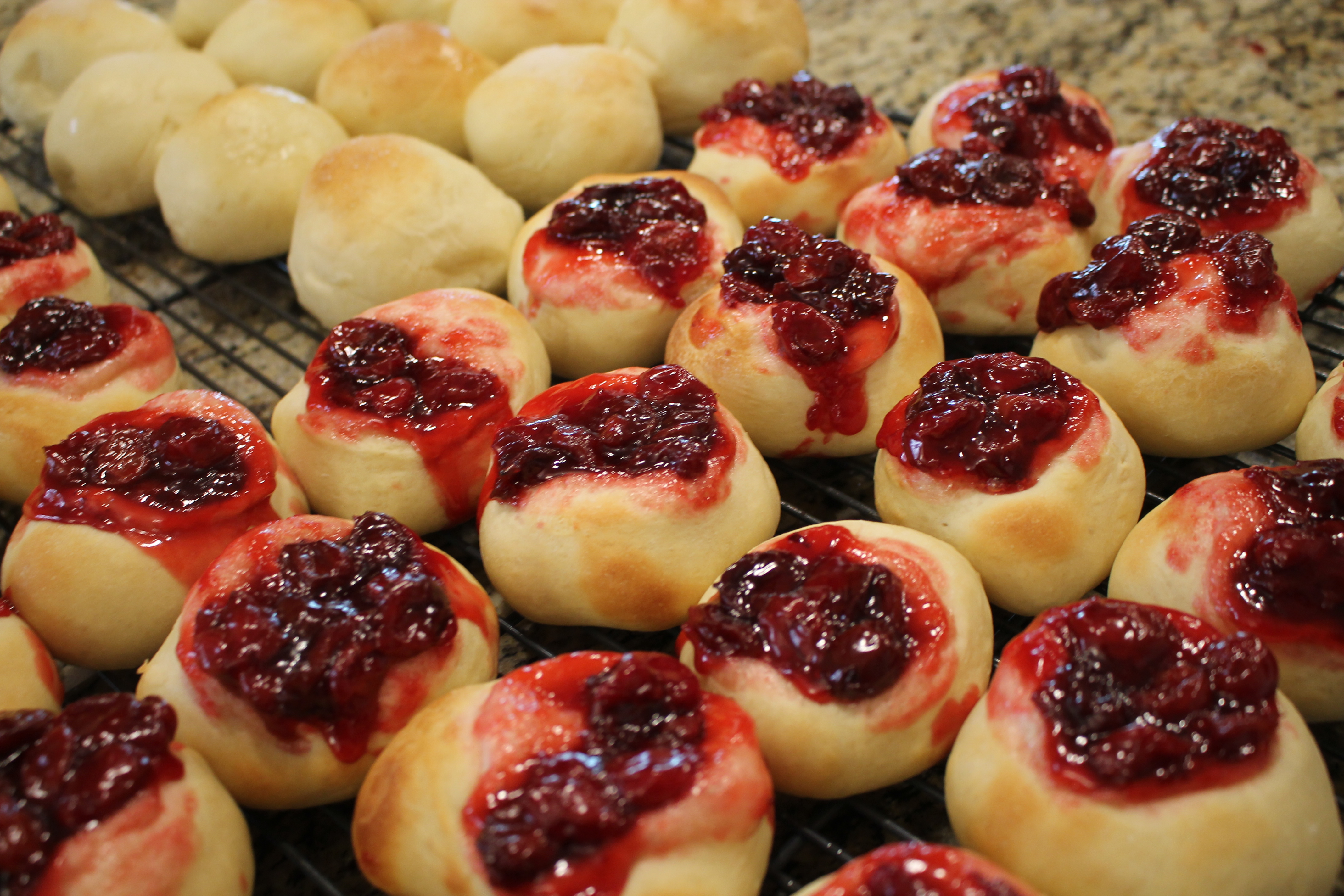 • When risen, push the centers of balls down and fill with cherry filling (or filling of your choice).  Let rise again.