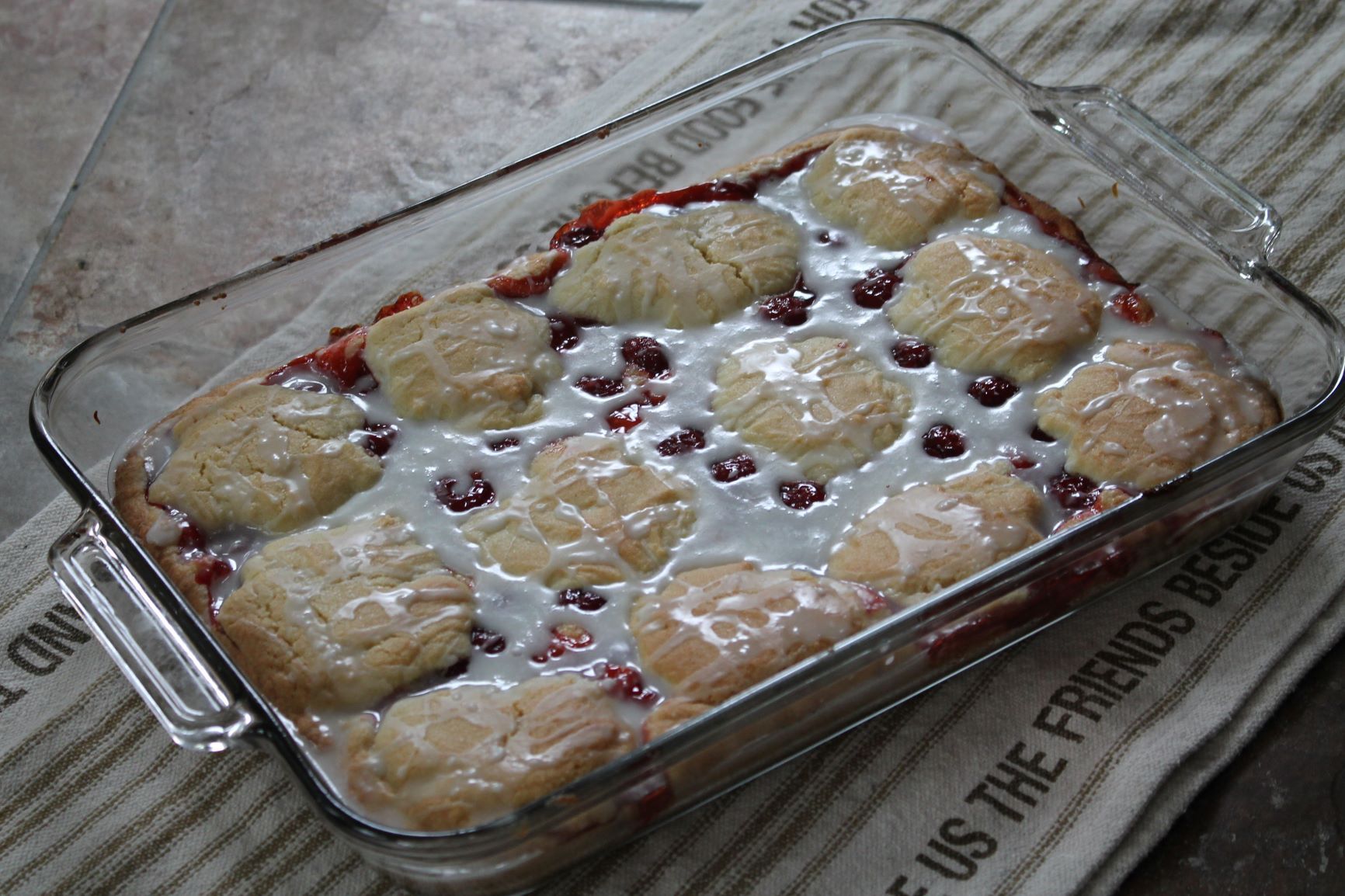 • Drizzle with glaze of 1 cup powdered sugar, 4 or more tsp. milk, a few drops of almond extract.  Add milk until the drizzle consistency is reached.