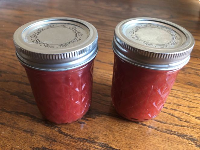 • Pour the hot jam into prepared canning jars.  At this point, the jam can either be stored in the refrigerator or processed for 10 minutes in a water bath canner.