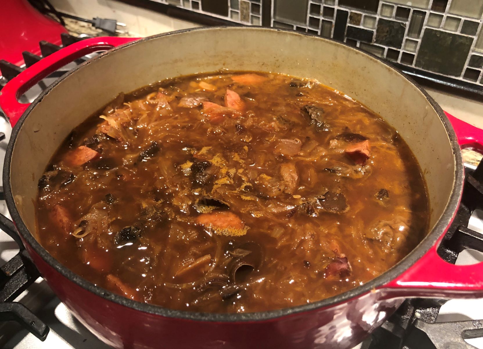One of the recipes shared was this Slovak Christmas Sauerkraut Soup.  It is traditionally made for Christmas Eve. I was not willing to wait until next December to make the soup!  The ingredients are things our ancestors would have had on hand:  wild dried mushrooms, sauerkraut, smoked sausage, etc.