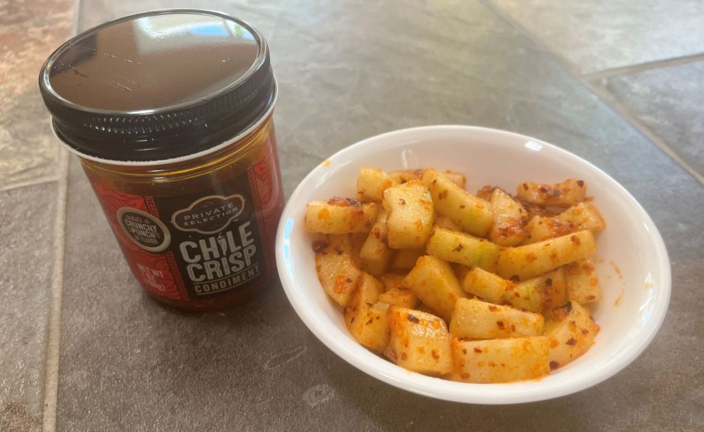 - Stir the jar of chile onion crunch then add 2-4 tablespoons to the cucumbers.