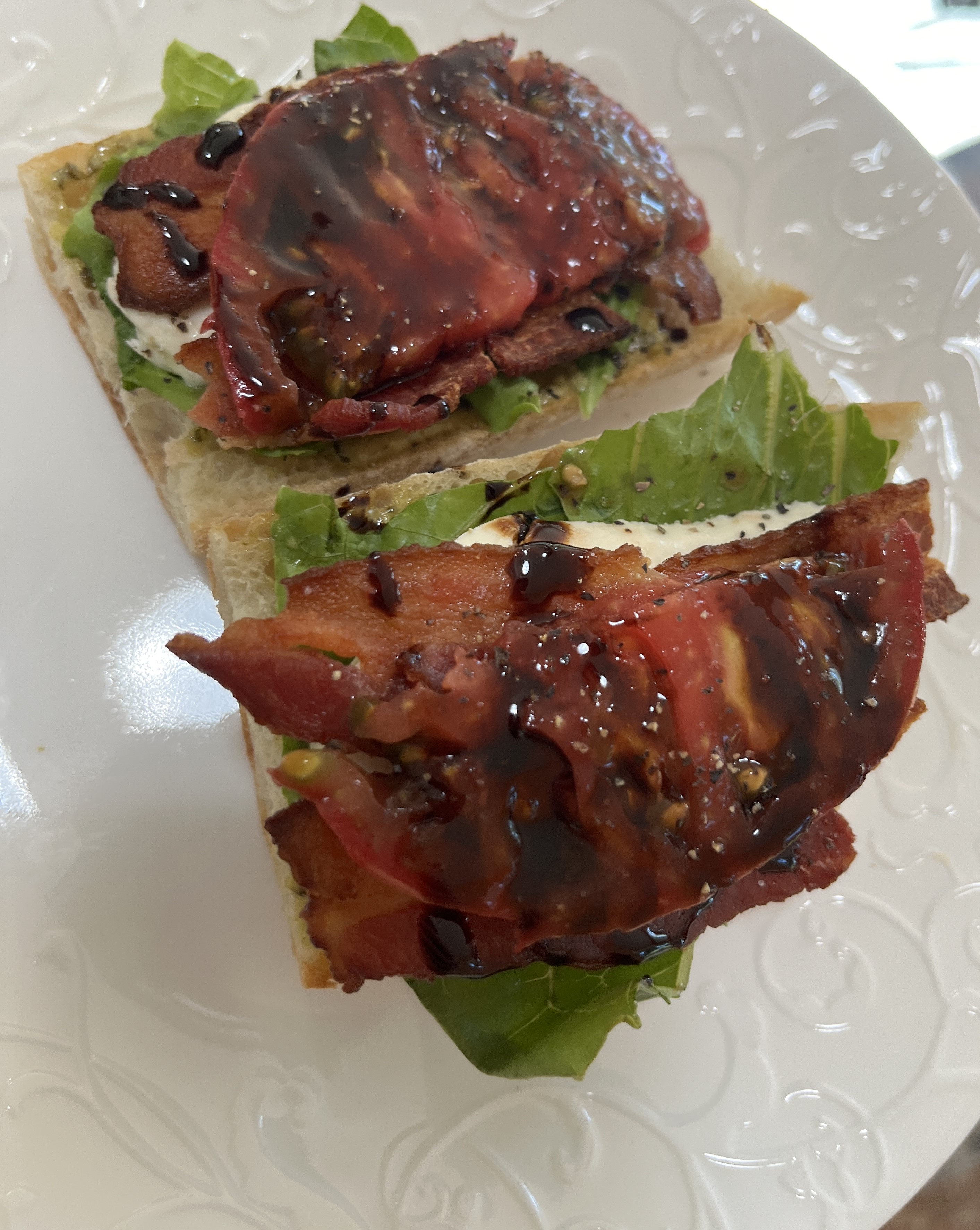 What is better than fresh heirloom tomatoes paired with bacon…wowza! I had a baguette on hand and toasted the bread and served as an open faced sandwich. It was delicious and so easy. I purchase the balsamic reduction/glaze at the grocery store but you can also make your own as shown in the original recipe.