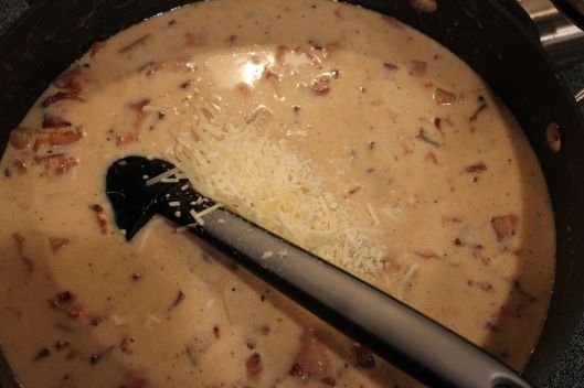 - Add onions and cook through. Drain most of the bacon fat off.
