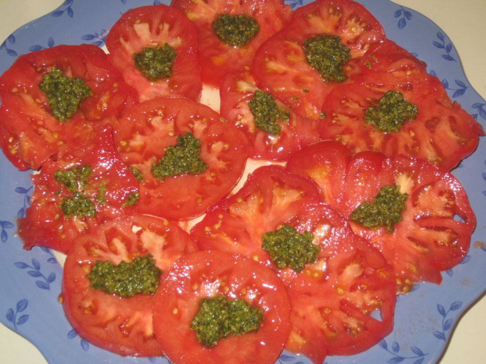 My tomatoes have been slow to produce this year but I have enjoyed a few fresh tomato salads. This time a juicy sliced tomatoes paired with homemade pesto (basil also from my garden) was the salad du jour.